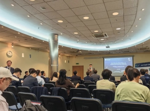 教育合作与交流是本次调研行程的重要组成部分,7月20日至21日调研团全体成员在莫斯科国立大学参加了第二届中俄基础科学论坛。论坛聚焦材料科学与化学领域等前沿课题,汇聚来自两国多所顶尖机构的100余位学者参与,共举行30余场学术报告及相关专题研讨。彭海琳院长带领的化学学科领域学术团队围绕二维材料界面调控、密度泛函近似的系统性优化、多肽合成与生物学应用、化学系统的液相电子显微成像等主题作了学术报告,全面展示了从理论研究到实验验证再到实际应用的科研进展。邹如强院长带领的材料学科领域学术团队,则聚焦AI赋能材料筛选与应用、先进储能材料及先进光伏材料等领域作专题报告,系统阐述了材料学科在前沿科学研究中的发展脉络与未来方向。