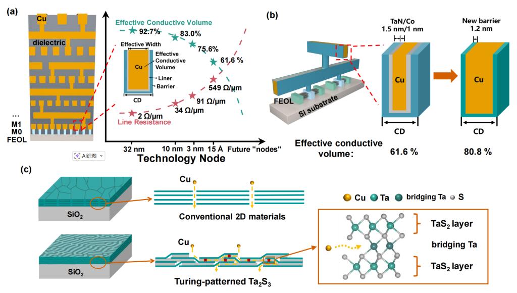 相关研究成果以 “Turing-patterned Ta2S3 enables sub-2 nm diffusion barrier for advanced Cu interconnects” 为题,发表于国际综合性学术期刊《Nature Communications》。