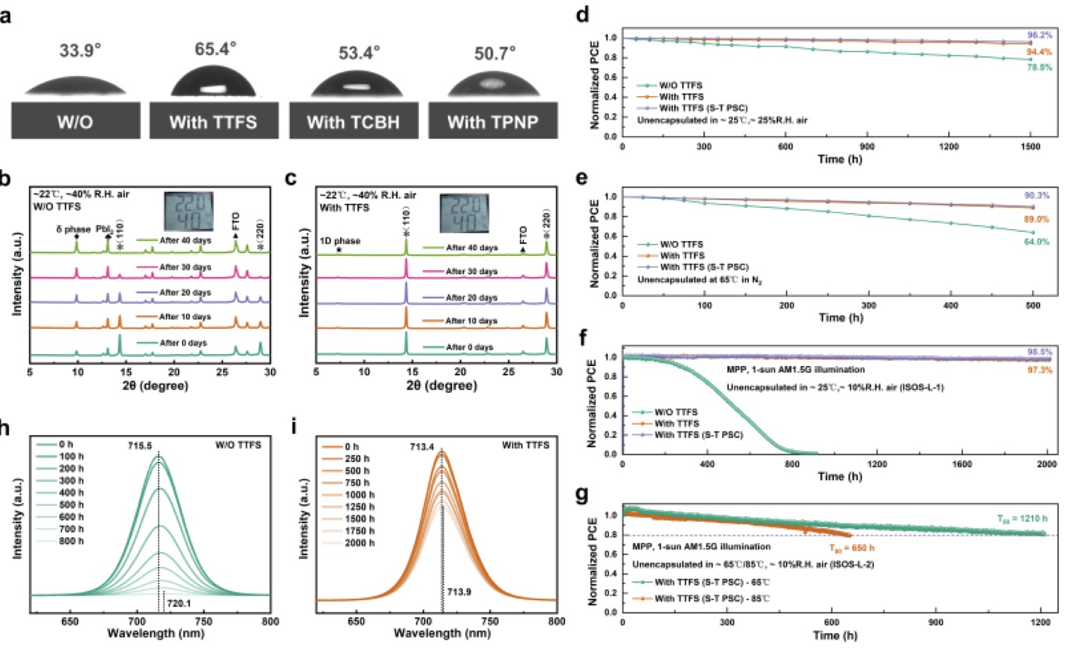 图3. 通过水接触角、加温加湿储存及ISOS-L-1/L-2运行稳定性等多维度测试,全面验证了TTFS诱导的1D/3D异质结赋予器件优异的疏水性与长期稳定性,其在85°C光照下T80达650小时,且老化后PL光谱未出现相分离红移。