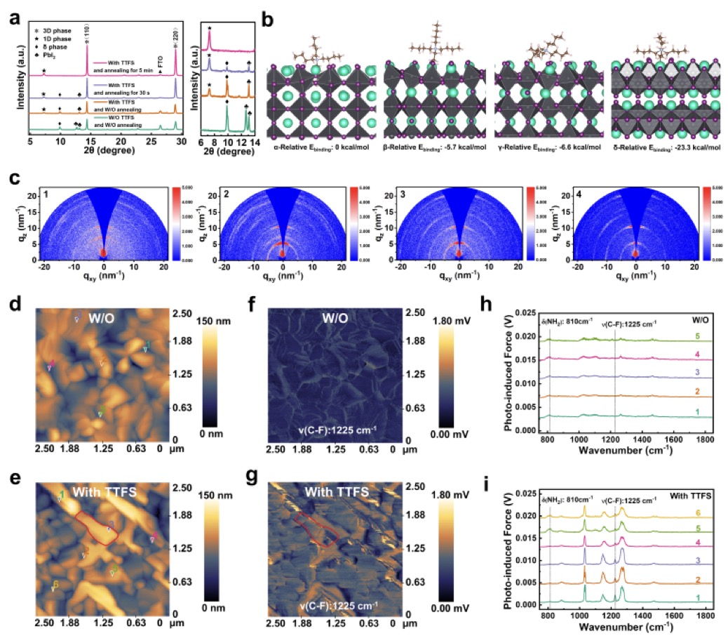 图2. 通过XRD、GIWAXS及AFM-IR等手段,揭示了TTFS优先转化δ相并原位自组装形成低维钙钛矿的动态过程,最终1D-TBAPbI₃相主要分布在表面细长晶粒处。